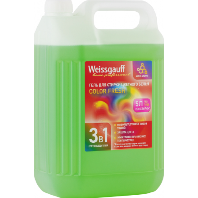 Гель с энзимами 3 в 1 Weissgauff Color Fresh объемом 5 литров — средство, созданное для деликатной стирки цветных вещей, которое рекомендуют ведущие производители. Сочетает в себе энзимы, оптический пятновыводитель, комплекс ухода за тканями и представляет высокоэффективное средство для стирки и удаления широкого спектра загрязнений, сохранения насыщенности оттенков и предотвращения выцветания тканей даже при частых стирках.  Средство сохраняет свою эффективность при эксплуатации в условиях пониженных температур, подходит для стирки деликатных тканей, включая детское белье, и рассчитано на 200 циклов стирки.  Средство содержит биоразлагаемые поверхностно-активные вещества, безопасные для тканей и окружающей среды. Его формула минимизирует риск раздражения кожи, обеспечивая мягкое воздействие, что делает его пригодным для ежедневной стирки, включая обработку детской одежды.  Регулярное использование геля помогает эффективно удалять пятна, предотвращать образование катышков, устранять неприятные запахи, сохранять цвет ткани и придать приятный аромат вашим любимым вещам!  Формула бережно воздействует на детали стиральной машины, помогает продлить её срок службы и идеально подходит для техники Weissgauff и других автоматических машин!
