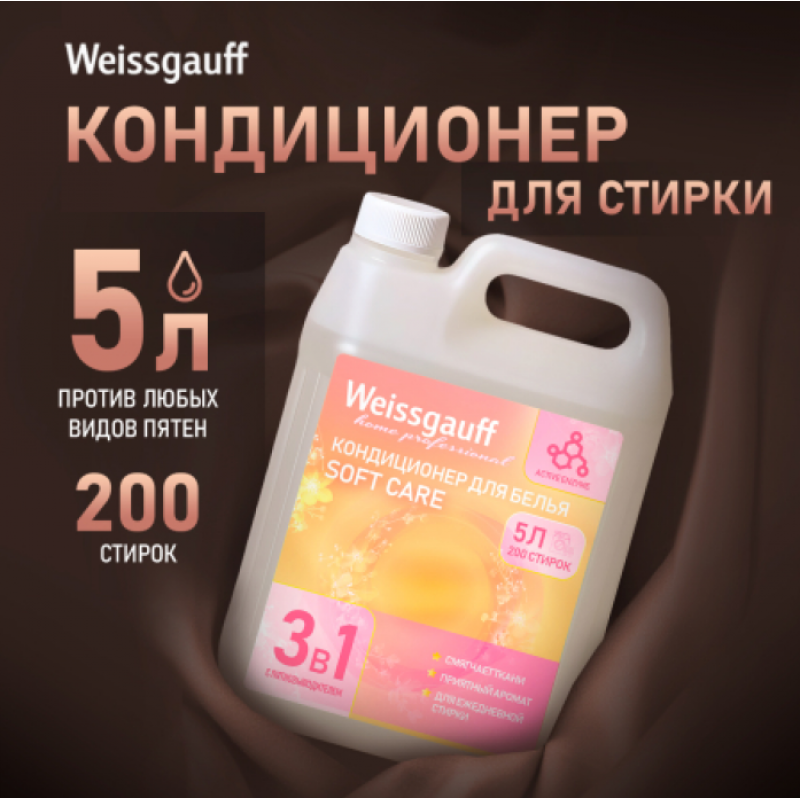 Кондиционер для белья 3 в 1 Weissgauff Soft Care объемом 5 литров предназначен для бережного ухода за вашими вещами. Он смягчает ткани, уменьшает статическое электричество, предотвращает прилипание и помогает сохранить форму одежды. Средство облегчает глажку и придает белью свежий аромат, оставляя ощущение мягкости после каждой стирки.    Экологичная формула с биоразлагаемыми компонентами и безопасными красителями заботится о вашем здоровье. Кондиционер универсален и подходит для всех типов тканей, обеспечивая комфорт во время носки. Он полностью выполаскивается, снижая вероятность раздражения кожи, и может использоваться ежедневно. Средство безопасно для всей семьи, включая использование при стирке детского белья.    Формула бережно воздействует на детали стиральной машины, помогает продлить её срок службы и идеально подходит для техники Weissgauff и других автоматических машин, а также при ручной стирке ваших любимых вещей!