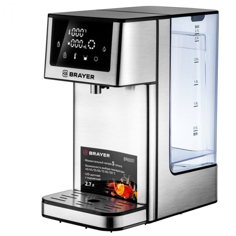 Возможность выбора объема порции воды 100/200/300/400 гр., либо режима непрерывной подачи
