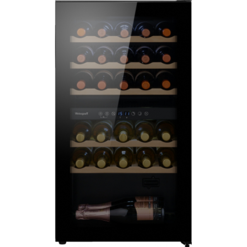 Габариты устройства 480 х 430 х 857 мм  - это оптимальные размеры, при выборе которых инженеры Weissgauff руководствовались целью создать для вас максимально вместительный и функциональный винный холодильник, который при этом окажется удобен в установке и не будет занимать лишнее место на вашей кухне!Компактные размеры - позволит вам расположить данный винный холодильник так, как это вам будет удобно, исходя из индивидуального проекта кухни вашей мечты!Две независимые зоны с раздельной настройкой температуры  - предоставят возможность организовать индивидуальный климат для одновременного хранения различных типов вин в холодильнике!Вместимость 29 бутылок позволит вам расположить в камере данного устройства достаточный запас вина, который станет приятным дополнением к вашему столу в течение продолжительного времени! С данным устройством от Weissgauff у вас больше никогда не возникнет ситуации, когда запас вина в доме подошел к концу, ведь теперь размещать и хранить его можно прямо на вашей кухне!Дизайн модели, выполненный в черном цвете, станет финальным штрихом в совершенстве великолепного облика этой модели. Каждый раз, заходя на кухню, вы будете чувствовать, что этот винный холодильник - не просто функциональное устройство, но и настоящее украшение в интерьере вашей кухни!Диапазон температур 5-22°С обеспечит достойные условия для хранения ваших вин, предлагая возможность создавать и поддерживать оптимальный температурный режим в зависимости от сорта и типа помещенного в камеру вина!Внутреннее освещение камеры, активирующееся при нажатии специальной кнопки на панели управления, наполнит ваш винный холодильник мягким и чистым светом, позволяющим легко увидеть все расположенные в нем бутылки с вином!Полностью электронное сенсорное управление - будет не только интуитивно понятным практически любому пользователю, но и отражает всю современность и технологичность подходов Weissgauff к созданию качественной и современной бытовой техники!Технические характеристикиСрок гарантии: 2 годаТип установки: ОтдельностоящаяЦвет: ЧерныйСистема охлаждения: КомпрессорнаяШирина, мм: 480Глубина, мм: 430Высота, мм: 860Количество бутылок: 29Количество зон: 2Диапазон температур: 5-22℃ /41-72℉ Управление: ЭлектронноеПодсветка камеры: ЕстьМатериал двери: СтеклоМатериал полок: ДеревоКласс энергоэффективности: GУровень шума, дБ: 36Вес устройства: 30 кг