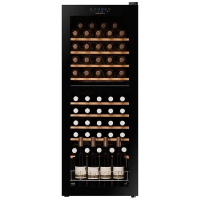 Тип винный шкафТип установки отдельностоящийМаксимальное количество бутылок 50 бутылокОхлаждение компрессорноеТемпературные зоны 2 зоныТемпература верхней зоны от +4°C до +18°CТемпература нижней зоны от +4°C до +18°CКоличество дверей 1 дверьМатериал корпуса стальЦвет чёрныйСтекло двойное с УФ фильтромРучка двери утопленнаяЦвет освещения синийДемонстрационное освещение естьКоличество полок 9 полокМатериал полок массив букаТип управления сенсорныйБлокировка панели управления естьВид охлаждения динамическийРезервуар для воды естьСигнализация отклонения температуры естьПамять настроек естьТермостат электронныйДиапазон влажности 60-80%Регулируемые ножки передниеУровень шума 41 дБЭнергопотребление в год 147 кВт/годКласс энергоэффективности GКлиматический класс T, N, SN, STХладагент R600AОбщий объем 142 лГабариты (ВхШхГ) 1295х480х470 ммВес 47.6 кгСрок гарантии 1 год