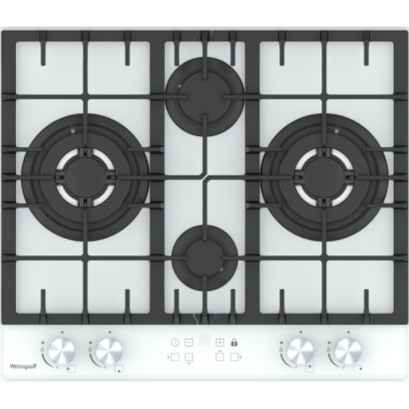 Ширина 600 мм это европейский стандарт качества, признанный миллионами довольных покупателей по всему миру!Белое закаленное стекло не только роскошно выглядит, подчеркивая великолепный внешний вид данной модели, но и отлично справляется с механическими воздействиями и температурными перегрузками!Решетки из высококачественного чугуна это неизменное качество, надежность и долговечность, воплощенные в каждой детали! Благодаря особому строению цельных решеток Weissgauff, размещение посуды на них становится ещё более удобным и устойчивым!  Таймер до 99 минут дает вам возможность запрограммировать время выключения любой конфорки, с точностью до минуты.Блокировка от детей, благодаря которой вы всегда сможете избежать ненужных нажатий на элементы управления таймером, например, во время уборки варочной панели или  чтобы предотвратить её незапланированное включение детьми.Две WOK-конфорки мощностью по 3,4 кВт, которые создают сразу три кольца пламени и позволяют осуществить нагрев даже самой крупногабаритной посуды в кратчайший срок!Газ-контроль каждой конфорки обеспечивает наивысшую безопасность: в случае, если пламя погасло, подача газа будет автоматически прекращена!Рукоятки Hi-Tech дополняют современный, по-немецки выверенный облик модели. Более того, конструктивные особенности строения и расположения этих рукояток защищают их от перегрева и деформации при длительном термическом воздействии в процессе приготовления еды!  Автоматический электроподжиг, независимо встроенный в каждую из рукояток, позволит зажечь любую конфорку за долю секунды, всего одним нажатием и поворотом руки, не прибегая к дополнительным приспособлениям!Технические характеристикиСрок гарантии: 2 годаМатериал панели конфорок: Закалённое стеклоСпособ подключения: газоваяКоличество конфорок: 4Материал решёток: чугунГаз-контроль конфорок: естьЭлектроподжиг: автоматическийШирина, мм: 584Глубина, мм: 510Вок-конфорка: естьЦвет панели конфорок: белыйСерия: PREMIUMПереключатели: поворотныеСуммарная мощность: 9600 ВтВес, нетто: 15,7 кгМощность конфорок, кВт: Вок-конфорка 3,4 кВт - 2шт, Средняя - 1,8 кВт - 1шт, Малая - 1 кВт - 1шт.Расход газа макс. в час: Природный газ: 0,912 м3/час, Сжиженный газ: 697,4 г/часКатегория газа: Природный газ (G20) - 20 мбар, Сжиженный газ (G30) - 30 мбар.Электроснабжение: 220-240 В~, 50-60 ГцРасположение панели управления: спередиСтрана производства: КитайСрок службы: 5 лет