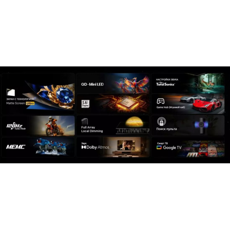 Мощность акустики 30WПоддержка HDR естьТип подставки по центруАкустическая схема 2.0Особенности игрового режима 120Hz Turbo Mode (HSR), Game ModeОбъем встроенной памяти 32 ГБОбъем оперативной памяти 2 ГБГод создания модели 2025Тип подсветки Mini-LEDТип пульта ДУ в комплекте BluetoothТип матрицы IPSОперационная система Google TVКоличество HDMI 2.1 3Поддерживаемые стандарты изображения PAL, SECAMТип батареек пульта ДУ АААТехнология обработки изображения MEMCЭкосистема GoogleСовместимость с голосовыми помощниками Google AssistantМощность звука 30 ВтКонфигурация аудиосистемы 2*15Функции и режимы функция поиска пульта ДУУправление и безопасность голосовое управление, защита от детей, пульт ДУ, родительский контроль, таймер сна, управление со смартфонаРазъемы и интерфейсы CI+/PCMCIA, HDMI, RJ-45 (Ethernet), S/PDIF (оптический), USB Type-A, для наушников, композитный (видео), стерео-аудиоОсобенности дизайна безрамочный дизайн, возможность крепления на стенуСтандарт Wi-Fi 802.11 a/b/g/n/ac (2.4+5ГГц)Версия Bluetooth v5.1Общее количество портов USB Type-A 2 штПорты USB 2.0 (Type-A) 2Технология HDR Dolby Vision, HDR10, HDR10+, HLGТип LED-телевизорОсобенности  Адаптивный датчик освещенности Трансляция экрана смартфона на ТВ Режим Filmmaker Mode Технология естественной передачи оттенков кожи AI Skin Detection с ИИ Технология улучшения четкости AI Motion Clarity с ИИ, Технология MEMC Технологии защиты зрения: Low Blue Light (сниженный синий свет)ЭкранДиагональ экрана (дюймы) 75"Диагональ экрана (см) 190 смРазрешение 3840x2160Стандарт разрешения экрана 4K Ultra HDПокрытие экрана матовоеЯркость экрана 380 кд/м2Контрастность 1.400:1Частота обновления 120 ГцСоотношение сторон 16:9Время отклика пикселя 11 мсУглы обзора (гориз/верт) 178x178Технология экрана QLED+ТюнерЦифровой тюнер DVB-T естьЦифровой тюнер DVB-T2 естьКабельный тюнер DVB-C естьСпутниковый тюнер DVB-S естьСпутниковый тюнер DVB-S2 естьЗвукКоличество динамиков 2Мощность одного динамика 15 ВтТехнологии звука Dolby Audio Dolby Atmos DBX-TV Wonder Audio Bluetooth AudioДекодерПоддержка Surround Sound естьФункцииВстроенный Bluetooth естьВстроенный Wi-Fi естьПроцессор изображения S' AI EngineПоддерживаемые технологии изображения Dolby Vision HDR10 HDR10+ HLG MEMC AI Motion Clarity AI Skin Detection Low Blue Light Flicker FreeМультимедиаПоддержка SMART TV естьВерсия операционной системы Google TVОсобенности SMART TVГолосовое управление Детский профиль Трансляция со смартфона Daily Shortcuts Daily Key Daily HubФорматы воспроизведения Различные форматы файлов видео, аудио, изображенийРазъемы и интерфейсыАнтенный вход 2Количество HDMI портов 3Разъем USB 2Тип разъема USB мультимедийныйРазъем композитный (видео) 1Разъем стерео аудио 1Разъем CI+/PCMCIA 1Разъем для наушников 1Разъем S/PDIF оптический 1Разъем RJ-45 (Ethernet) 1ПитаниеТип блока питания встроенныйЭнергопотребление в рабочем режиме 220 ВтЭнергопотребление в режиме ожидания 0.5 ВтКласс энергоэффективности AКорпусРазмер VESA 400x200Покрытие корпуса матовоеЦвет телевизора черный/серыйРазмеры без подставки 1667x966x94ммВес без подставки 19.4 кгВес товара 20.1 кг