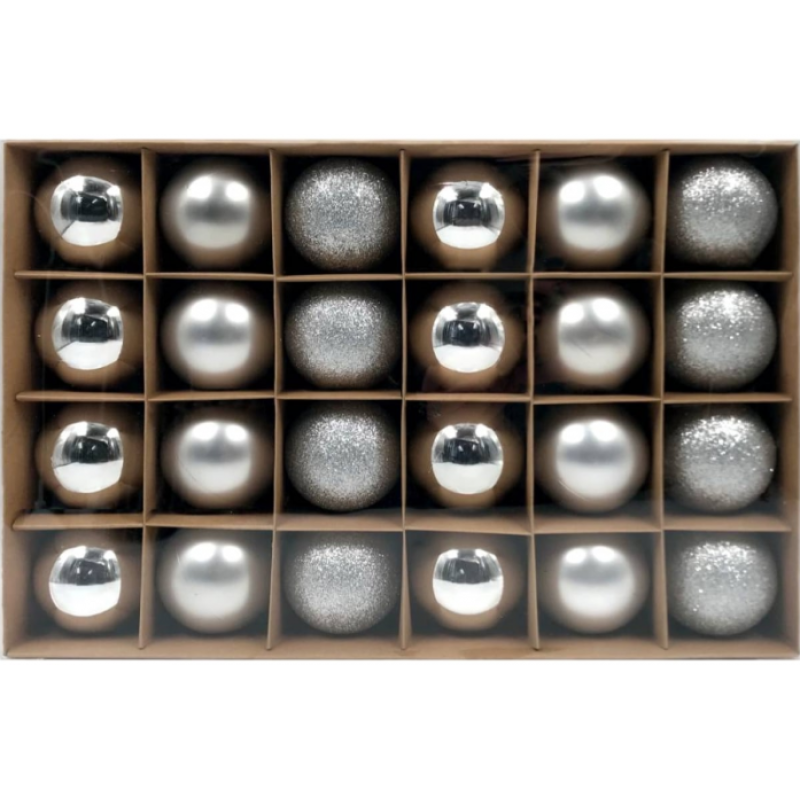 Тип: набор ёлочных шаровКоличество шаров в упаковке: 24 штТип крепления: подвесДлина игрушки: 60 ммШирина игрушки: 60 ммМатериал: пластикЦвет:  серебряный  миксГабариты без упаковки: 360х240х60 ммВес нетто: 0.339 кгРазмер транспортной упаковки: 50x39x39 см