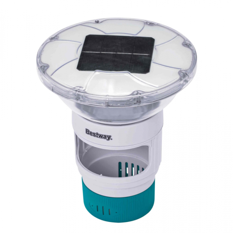 Дозатор для химии с LED-подсветкой Bestway SolarGlow (58943 BW).Таблетки: вмещает 3 хлорные или бромные таблетки диаметром до 7,6 см (таблетки не входят в комплект).Подсветка: 4-цветная светодиодная подсветка (3 световых режима с 9 вариантами цветов: 4 статичных и 5 комбинаций).  Питание подсветки: солнечная панель, включает свет автоматически с наступлением темноты.Зарядка и работа: полная зарядка за 7–10 часов (в зависимости от погодных условий), время непрерывной работы — 6–8 часов.Пульт дистанционного управления: беспроводной водонепроницаемый пульт для изменения светового режима на расстоянии до 15 м.Защита: степень защиты IP68 — полностью водонепроницаем, можно погружать в воду, защищён от пыли.Размер: 18х18х21,5 см