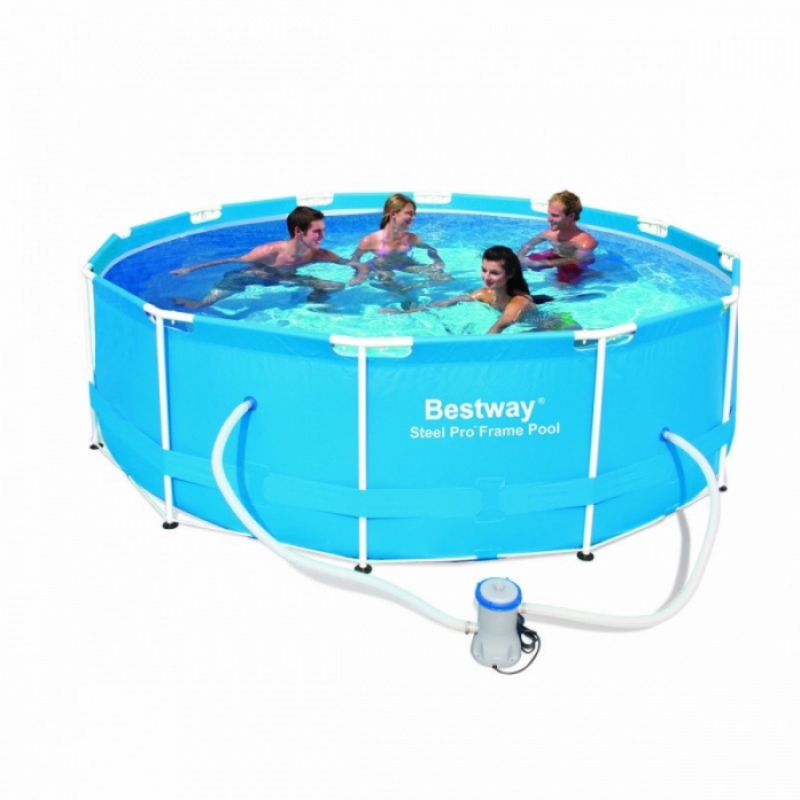 Сборный каркасный бассейн Bestway 56418 круглой формы с фильтр-насосом и лестницей.Чаша бассейна выполнена из высококачественного трехслойного ПВХ: два слоя плотного винила и один - полиэстер для особой прочности. Каркас металлический нержавеющий, устойчивый к погодным воздействиям и повышенной влажности.Установка простая, не требуется бетонирования и подготовки площадки, необходима только плоская горизонтальная площадка. Сезонный бассейн (рекомендуется разбирать на холодное время года)  - может быть легко разобран и собран заново. Время сборки и подключения основных узлов бассейна не более 1-2 часов.Имеется удобный сливной клапан, подключается к садовому шлангу, что дает возможность слить воду в любое удобное место.  Комплектация: