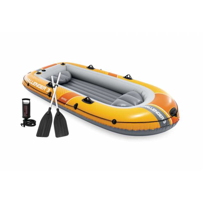Ключевое преимущество этой лодки заключается в ее высокой мобильности: компактные размеры и легкий вес, а также возможность складывания делают транспортировку к воде легкой и удобной.  Рекомендовано использовать в спокойных водоемах. 3 местная лодка Intex Challenger-3 Set с надувным полом— это идеальный выбор для любителей спокойной рыбалки на реке или озере. Рыбацкая лодка имеет три независимых воздушных отсека, что обеспечивает дополнительную безопасность и устойчивость на воде.  Надувное дно гарантирует комфорт во время эксплуатации, а держатели для весел добавят удобства. Материал, используемый для изготовления лодки, обладает высокой прочностью и имеет толщину в 0,50 мм. В комплект входит насос для быстрой и легкой накачки.  Также модель, оснащена веслами, что позволит получить удовольствие от гребли и насладиться окружающими пейзажами. Эта большая двухместная лодка идеально подходит для приятного времяпрепровождения.