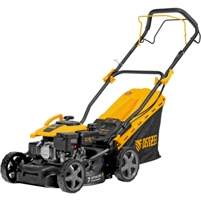 Бензиновая газонокосилка Denzel GLD-410SP-K 58813 с двигателем объемом 150 см³ и травосборником объемом 40 л обеспечивает ширину скашивания 41 см. Предназначена для стрижки газонов и кошения травы в саду и огороде.  Двигатель мощностью 3,5 л. с. позволяет эффективно решать поставленные задачи. Высота скашивания регулируется, предусмотрено 7 уровней (25-75 мм), что позволяет получить нужное травяное покрытие. Газонокосилка оптимальна для ухода за небольшим дачным участком.Ключевое отличие газонокосилки Denzel GLD-410SP-K от конкурентов — наличие привода на колеса, функций мульчирования и бокового выброса, а также уникальный дизайн.Преимущества3 в 1 — боковой выброс, мульчирование и сбор в травосборник.Привод на колеса — газонокосилку не нужно толкать, достаточно лишь направлять, что значительно облегчает процесс скашивания.Простая регулировка высоты скашивания — достаточно установить рычаг в нужное положение.Удобное использование — комбинированный травосборник легко перемещать и очищать.Контроль количества травы в травосборнике — специальный индикатор позволяет оценить степень его наполненности.Быстрая очистка — удалить остатки травы и грязь с внутренней поверхности деки можно под напором воды, подключив шланг к специальному штуцеру при помощи быстросъемного коннектора.Удобное перемещение — колеса с подшипниками легко вращаются, что упрощает передвижение по участку.Несложное обслуживание — воздушный фильтр быстро извлекается для очистки или замены.Продуманная конструкция — рукоятка с эксцентриковыми фиксаторами легко складывается, газонокосилка не занимает много места в зоне хранения.Гарантия 3 года — надежность техники подтверждена производителем.ХарактеристикиДополнительные функции регулировка высоты скашивания, функция мульчированияСистема выброса боковойКоличество колес четырехколеснаяКонструктивные особенности регулировка ручки по высотеТравосборник мягкий с жестким верхомОбъем травосборника 40 лШирина скашивания 41 смМатериал корпуса пластикЧисло уровней высоты скашивания 7Минимальная высота скашивания 25 ммМаксимальная высота скашивания 75 ммТип двигателя бензиновыйМощность 3.5 л.с.Объем двигателя 150 см³ Емкость топливного бака 0.8 лОбъем масла 0.8 лШирина 41 см