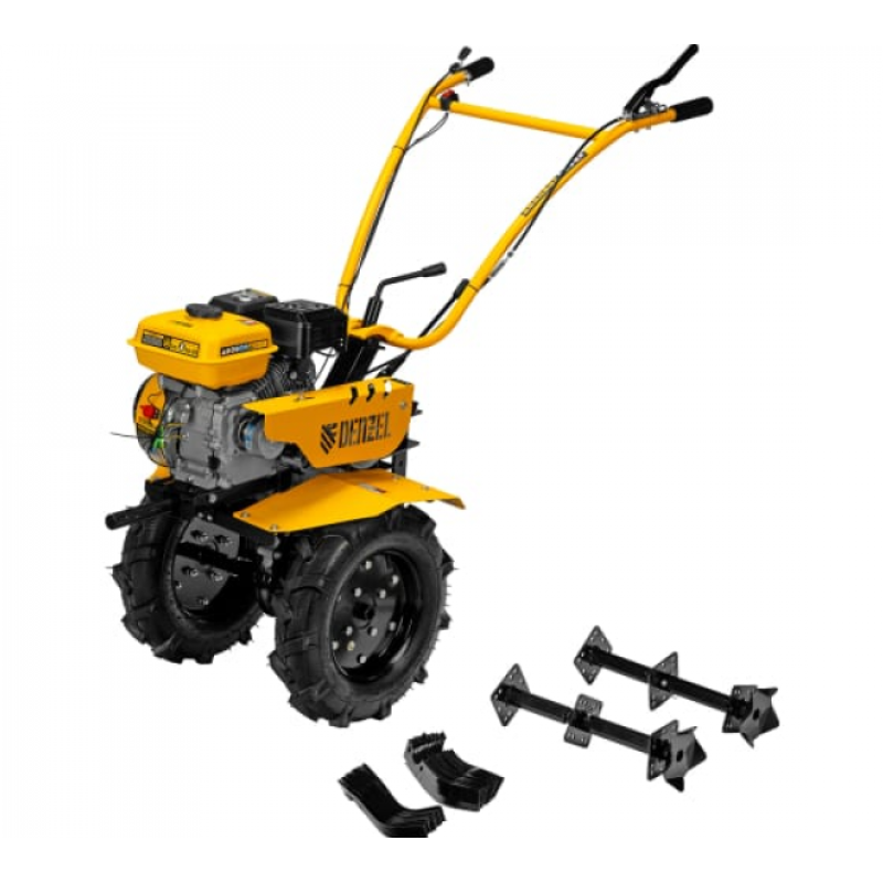 Мотоблок Denzel dpt-170s предназначен для проведения сельскохозяйственных работ.Фрезы собираются из двух двойных и двух одинарных секций, что позволяет регулировать ширину вспашки.Надежность. мощный 4-тактный двигатель серии Long Life обеспечивает длительную стабильную работу мотоблока.Эффективная работа. Благодаря усиленному шестеренчато-цепному редуктору с чугунным корпусом мотоблок успешно справляется даже с плотным, глинистым грунтом.Безопасность. Защитные крылья предотвращают вылет из-под колес комьев земли и твердых предметов.Технические характеристикиМощность (кВт) 5.15Мощность (л.с.)  7Глубина вспашки  35 смПроизводитель двигателя DenzelШирина вспашки  100 смСкорости  2 вперед/1 назадС дифференциалом нетПередача мощности на активное навесное оборудование  шкив (ременная)Электрозапуск нетСтупица шестигранник 23 ммВес нетто  72 кгТип двигателя  бензиновыйТип редуктора шестеренчато-цепнойОбъем двигателя 212 см³ Емкость топливного бака  3.6 лСцепление ременноеДиаметр колес 25.4 смДиаметр фрез 35 смПреимуществаДолговечность — система защиты не позволит запустить двигатель при низком уровне масла.Настраиваемая глубина вспашки — степень погружения фрез в почву можно задать, отрегулировав сошник по высотеЗащита двигателя от поломки — воздушный фильтр препятствует попаданию в цилиндр твердых частицУдобная работа — основные элементы управления расположены на рукоятках, для включения сцепления и регулировки оборотов двигателя не нужно наклонятьсяМаневренность — две скорости вперед и одна назад, а также пневматические колеса обеспечивают повышенную проходимостьКомфорт пользователя — руль регулируется в 2-х плоскостях, что позволяет установить его в наиболее удобное положение