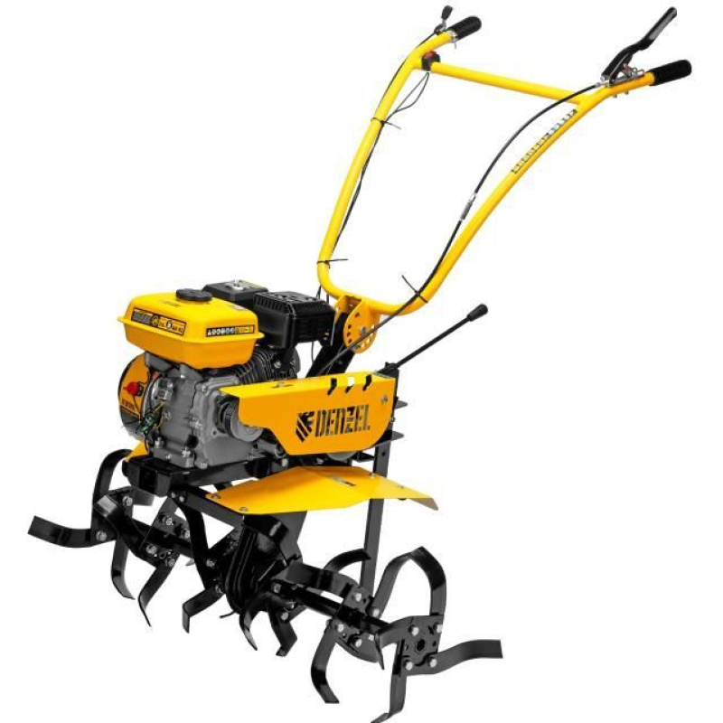 Мотоблок Denzel dpt-270sb предназначен для выполнения земляных работ: рыхления, вспахивания, прополки и т. д. Успешно справляется даже с плотной, глинистой почвой.Разборные фрезы с дополнительными секциями позволяют регулировать ширину обработки до 1 мНадежность. Мощный и экономичный 4-тактный двигатель серии Long Life с воздушным охлаждением обеспечивает стабильную работу на протяжении длительного времени.Высокая прочность. Шесть рядов фрез из закаленной стали не деформируются при высоких нагрузках, подходят для обработки любого грунта и не требуют повторной заточки.Система защиты от поломки. Двигатель не запустится при низком уровне масла.Технические характеристики  Мощность (кВт) 5.15Мощность (л.с.)  7Глубина вспашки  35 смПроизводитель двигателя DenzelШирина вспашки  100 смСкорости  2 вперед/1 назадС дифференциалом нетПередача мощности на активное навесное оборудование  шкив (ременная)Электрозапуск нетСтупица шестигранник 23 ммВес нетто  70 кгТип двигателя  бензиновыйТип редуктора шестеренчато-цепнойОбъем двигателя 212 см³ Емкость топливного бака  3.6 лСцепление ременноеДиаметр фрез 35 смПреимущества  Маневренность — 2 скорости вперед и 1 назад обеспечивают уверенное передвижение по участкуНастраиваемая глубина вспахивания — отрегулировав сошник по высоте, можно задать степень погружения фрез до 350 ммБезопасность пользователя — защитные крылья предотвращают вылет комьев земли и других предметовУдобная эксплуатация — основные элементы управления вынесены на рукояткиКомфортное использование — руль регулируется в вертикальной плоскости, что позволяет установить оптимальную высоту в зависимости от роста пользователя