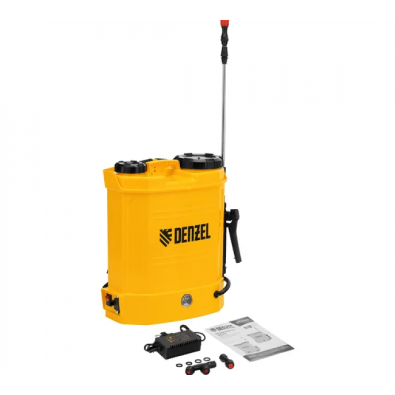 Ранцевый аккумуляторный опрыскиватель Denzel D-12LA 64788 с баком объемом 12 л и батареей на 12 В, емкостью 8 А*ч, предназначен для распыления воды или инсектицидов. Используется для ухода за растениями, дезинфекции помещения, мытья окон и фасадов. Длина штанги регулируется в диапазоне 470-820 мм, а максимальная дальность распыления составляет 4 м, что облегчает обработку труднодоступных мест.Технические характеристики    Тип аккумуляторныйМатериал пластикОбъем бака для расп.вещ 12 лТип аккумулятора свинцово-кислотныйКоличество аккумуляторов в комплекте 1Напряжение аккумулятора 12 ВДлина штанги 470-820 ммХимостойкость естьВес нетто 5 кгДлина шланга 1.2 мДиаметр разбрызгивания 4 мРасход жидкости 3.1 л/минЕмкость аккумулятора 8 А*чТелескопическая штанга естьСпособ переноски плечевойПреимущества  Бесперебойная работа — полного заряда аккумулятора хватает на 5 часов работы, что в сочетании с вместительным баком позволяет обрабатывать участки большой площади без перерывов на дозаправку и подзарядку.Максимально комфортное использование — опрыскиватель не зависит от электросети, не требует сложного технического обслуживания и не выделяет неприятного запаха и вредных выхлопов.Контроль уровня заряда аккумулятора — опрыскиватель оснащен встроенным вольтметром.Функциональность — в комплекте имеются 3 насадки-распылителя, а интенсивность струи регулируется, что позволяет выбрать оптимальный режим работы.Защита от загрязнений — съемный фильтр препятствует попаданию в бак посторонних частиц, продлевая срок службы опрыскивателя.Эргономичность — широкая горловина бака упрощает и ускоряет заливку жидкости.Зарядное устройство в комплекте — опрыскиватель полностью готов к использованию после покупки.Удобное перемещение — плечевые ремни с мягкими накладками равномерно распределяют вес опрыскивателя, снижая нагрузку на спину.