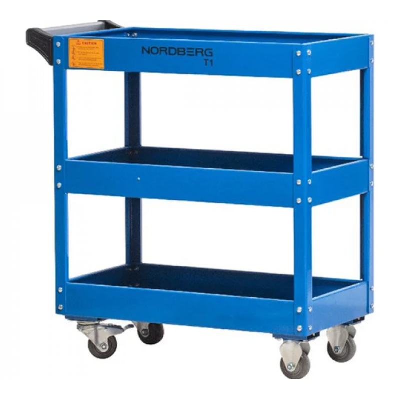 Профессиональная тележка NORDBERG T1(B) имеет открытую конструкцию, состоящую из трех полок. Наличие колес позволяет легко перемещать тележку по рабочей площадке. Колеса дополнительно оснащены поворотным механизмом и тормозом. Размеры полок (ДхШ): 685х355 мм.Технические характеристики    Количество полок 3Инструмент в комплекте нетСистема хранения полкаКоличество ящиков нетКоличество предметов нетЦвет синийДлина 790 ммШирина 385 ммВысота 835 ммВес нетто 16.36 кг