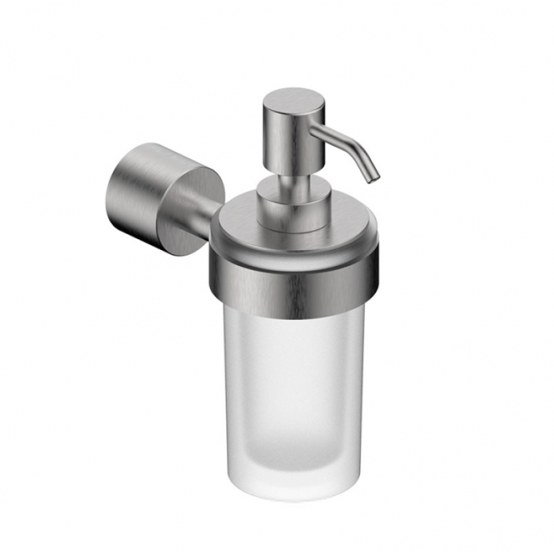 Тип: дозатор для жидкого мылаНазначение: для ванной комнатыМонтаж: подвеснойКоличество монтажных отверстий: 1Метод крепления: шурупыУправление: механическоеОбщий размер: 14х6.8х16.8 смМатериал: нержавеющая сталь, стекло, пластикПоверхность: матоваяЦвет:  сталь брашированная