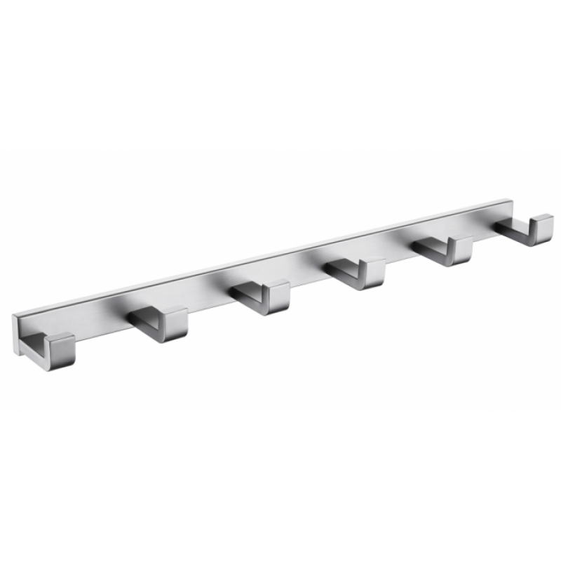 Тип: вешалкаНазначение: для ванной комнатыМонтаж: подвеснойКоличество монтажных отверстий: 2Размер: 47х6х3 смКоличество крючков: 6Материал: нержавеющая стальПоверхность: матоваяЦвет: сатин