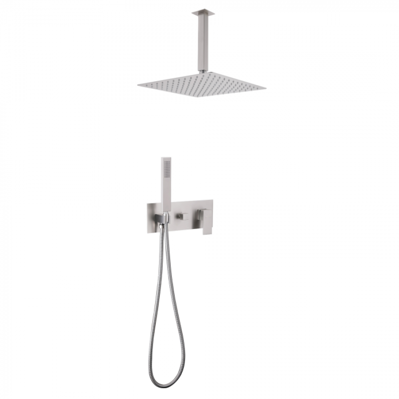Тип: душевая система скрытого монтажаНазначение: для душаМонтаж: скрытыйПодводка: жесткаяСтандарт подводки: 1/2Излив: нетЛейка в комплекте: даКоличество режимов душевой лейки: 1Держатель для душевой лейки: естьВерхний душ: естьФорма верхнего душа: квадратнаяРазмер верхнего душа: 300x300 ммСистема против известковых отложений: даМатериал: латуньЦвет: сатин