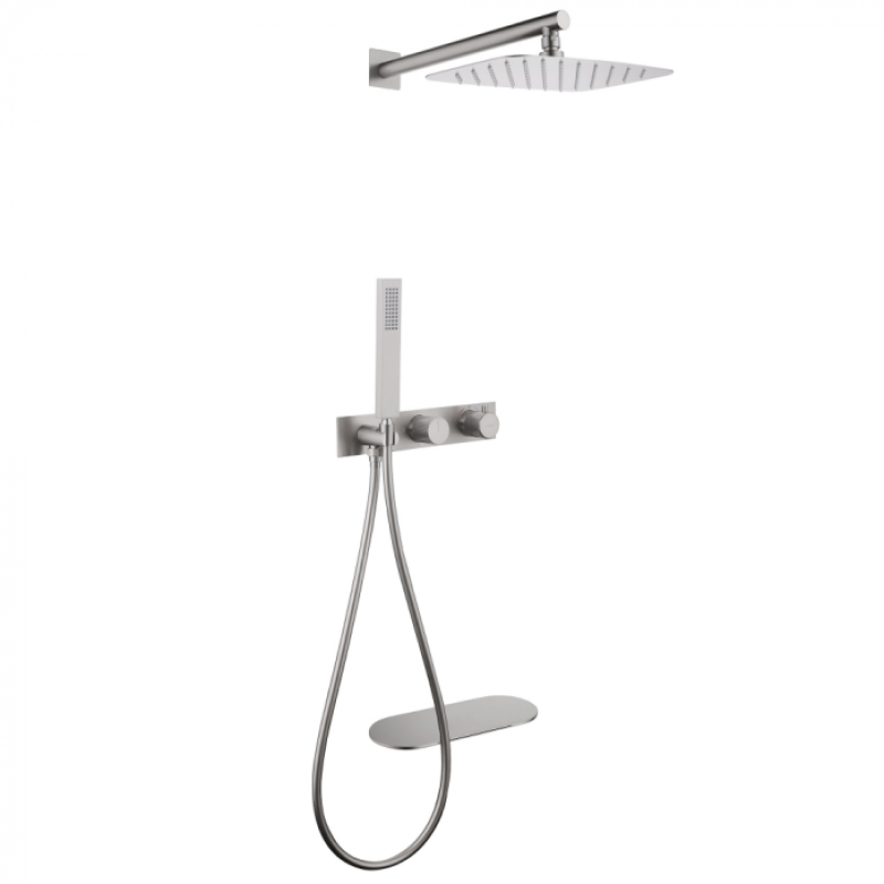 Тип: душевая система скрытого монтажаНазначение: для душаМонтаж: скрытыйПодводка: жесткаяСтандарт подводки: 1/2"Смеситель: термостатИзлив: естьЛейка в комплекте: даКоличество режимов душевой лейки: 1Держатель для душевой лейки: естьВерхний душ: естьФорма верхнего душа: прямоугольнаяРазмер верхнего душа: 300x200 ммПолочка: естьСистема против известковых отложений: даМатериал: латуньЦвет: сатин