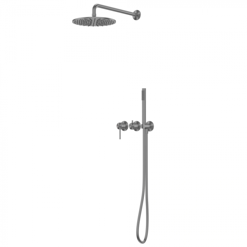 Тип: душевая система скрытого монтажаНазначение: для душаМонтаж: скрытыйПодводка: жесткаяСтандарт подводки: 1/2"Излив: нетСмеситель: однорычажныйЛейка в комплекте: даКоличество режимов душевой лейки: 1Держатель для душевой лейки: естьВерхний душ: естьФорма верхнего душа: круглаяРазмер верхнего душа: 250 ммСистема против известковых отложений: даМатериал: латуньПоверхность: матоваяЦвет:  оружейная сталь брашированная