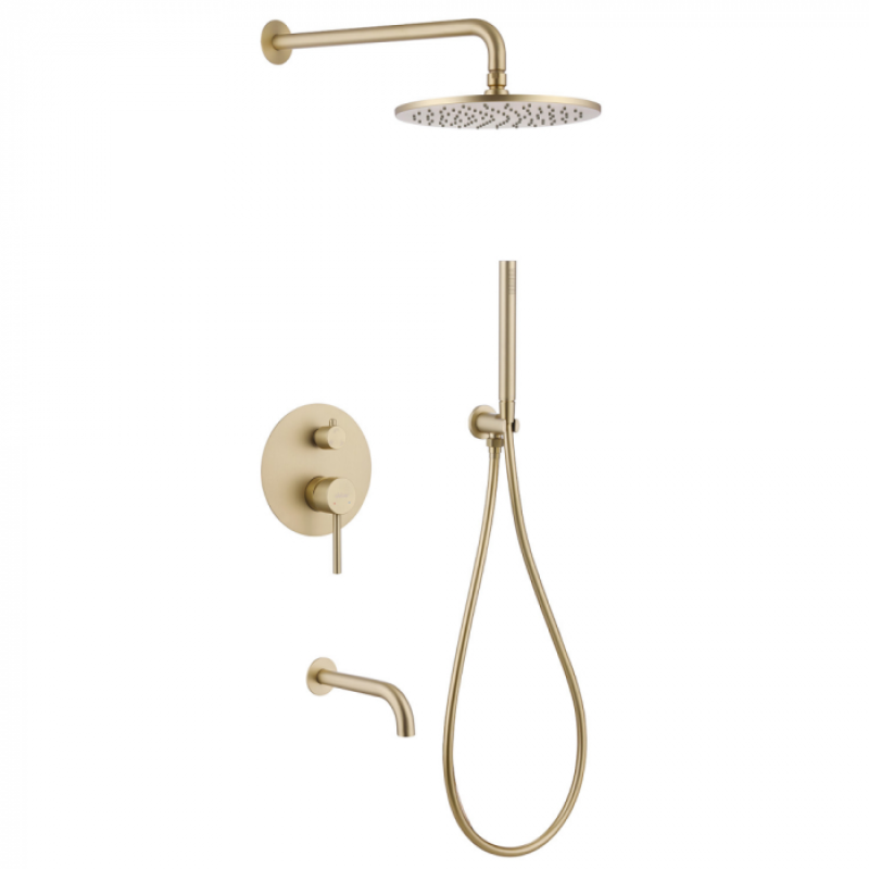 Тип: душевая система скрытого монтажаШирина: 25 смВысота: 125 смГлубина: 51 смМонтаж: скрытыйПодводка: жесткаяСтандарт подводки: 1/2Излив: естьСмеситель: однорычажныйЛейка в комплекте: даРазмер ручной лейки: 20 смДержатель для душевой лейки: естьВерхний душ: естьФорма верхнего душа: круглаяРазмер верхнего душа: 250 ммСистема против известковых отложений: даМатериал: латуньЦвет: золото матовое