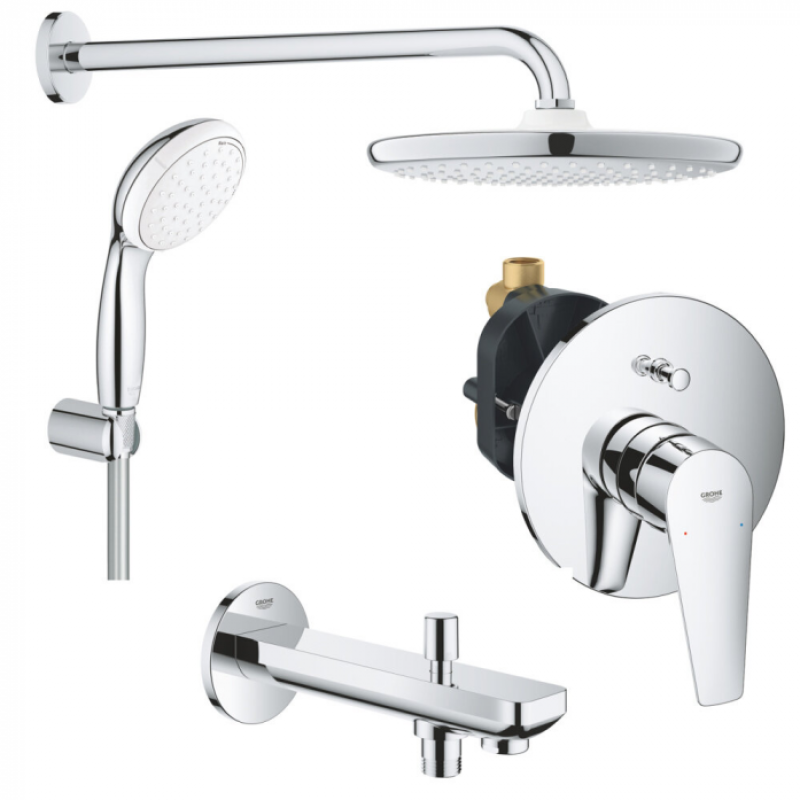 В комплекте: Верхний душ GROHE Tempesta 250 с душевым кронштейном 380 мм, 1 режим струи, хром (26668000)Верхний душ Tempesta 250 (26666). 1 вид струи: Rain. Тыльная часть верхнего душа белая.Душевой кронштейн 380 мм (28361).Внутренний охлаждающий канал для продолжительного срока службы.Может использоваться с проточным водонагревателем.Минимальное давление 1,0 бар.Смеситель для ванны GROHE BauEdge скрытого монтажа, в комплекте с монтажной частью, хром (29079001)Скрытый монтаж.Комплект готового монтажа.Металлический рычаг.Корпус встраиваемого смесителя.Регулировка расхода воды.Автоматический переключатель: ванна/душ.Уплотнитель розетки и рычага.Дополнительный ограничитель температуры (46375000).Душевой набор GROHE Tempesta 100, 2 режима, 1250 мм, 9,5 л/мин, хром (27799001)Ручной душ Tempesta 100 II (27597).Настенный держатель ручного душа без регулировки (28605).Душевой шланг Relexaflex 1250 мм 1/2" x 1/2" (28150).Внутренний охлаждающий канал для продолжительного срока службы.Минимальное давление 1,0 бар.Излив для ванны GROHE BauContemporary с переключателем ванна/душ, хром (13390000)Настенный монтаж.Аэратор.Обратный клапан.Автоматический переключатель: ванна/душ.Вынос 170 мм.Внутренняя резьба 1/2".