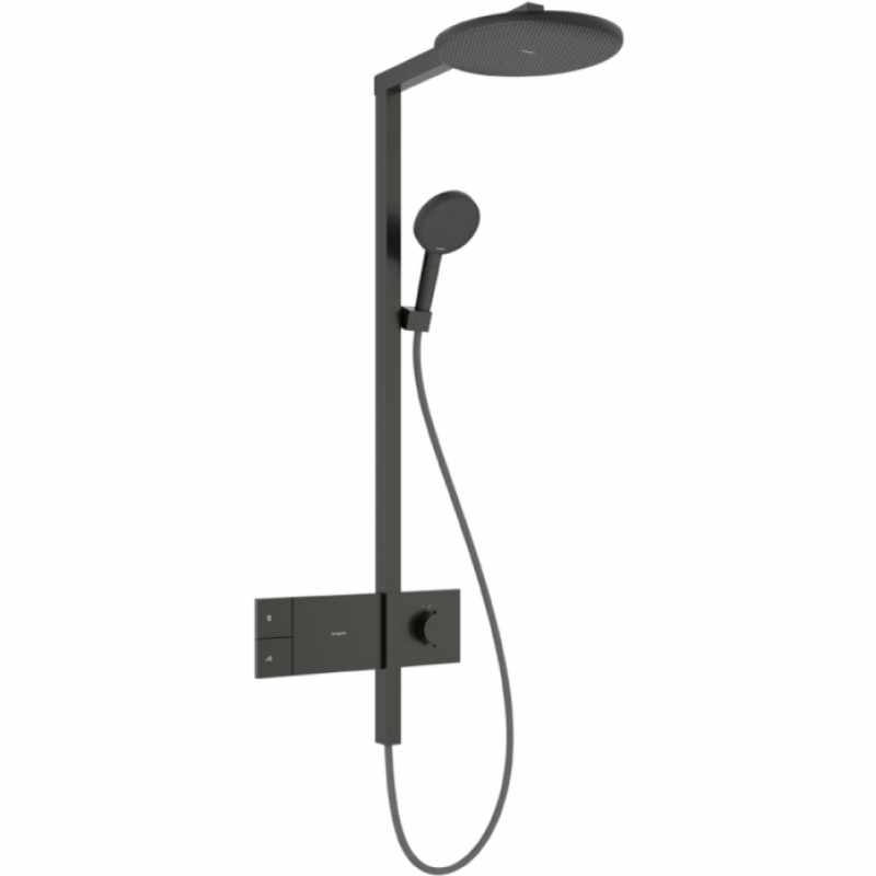 Непревзойденный комфорт: С верхним душем диаметром 300 мм вы сможете насладиться каскадом воды, который обволакивает вас, как нежный дождь. Выбирайте между струей RainAir для легкого и воздушного ощущения или массажной струей для глубокого расслабления после долгого дня.Индивидуальная настройка: С ручным душем с несколькими режимами, включая RainAir, PowderRain и массажную струю, вы можете легко адаптировать ваш душ под настроение.  Современные технологии: Термостат ShowerSelect Comfort обеспечивает идеальную температуру воды с предохранительной остановкой на уровне 40 °C, что делает принятие душа безопасным и комфортным для всей семьи. Забудьте о резких перепадах температуры!Экономия воды: С максимальным расходом 11,8 л/мин вы не только заботитесь о природе, но и экономите на счетах за воду. Эффективность и забота об экологии в одном решении!Легкий уход: Съемный душевой диск позволяет быстро и просто очищать систему от известкового налета, обеспечивая долгосрочную работу устройства.Тип: душевая системаУправление: термостатМеханизм: термостатический картриджВстраиваемая система: нетСтандарт подводки: 1/2Межосевое подключение: 150 ммМонтаж: настенный внешнийS-образные эксцентрики: естьТип подводки: жесткаяРазмер верхнего душа, мм: 300Тип струи верхнего душа: PowderRain, RainAirРазмер ручного душа, мм: 125Тип струи ручного душа: PowderRain, RainAir, МассажнаяМаксимальный расход воды, л/мин: 11.8Длина держателя для душа, мм: 450Вид держателя: для верхнего душаЗащита от перекручивания: естьПодходит для проточных водонагревателей: даРасход воды: стандартныйПереключение типов струй: кнопка SelectЗащита от обратного тока воды: естьКомплектация: верхний душ, ручной душ, держатель, термостат для душа, шланг для душа, душевая штангаМатериал: латунь, пластикЦвет:  шлифованный черный хром