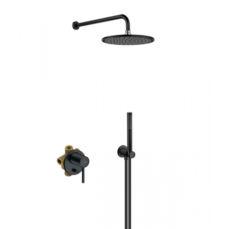Тип: душевая система (внешняя и скрытая часть)Назначение: для душаМонтаж: настенный (внутристенный)Количество монтажных отверстий: 3Управление: рычажноеТип подводки: жесткаяСтандарт подводки: 1/2"Диаметр верхнего душа: 250 ммМинимальное рабочее давление: 1 барМаксимальное рабочее давление: 10 барКерамический картридж с ограничителем горячей водыМеханизм регулировки держателя ручной лейки: нерегулируемыйМатериал: латуньПоверхность: матоваяЦвет: черный матовый