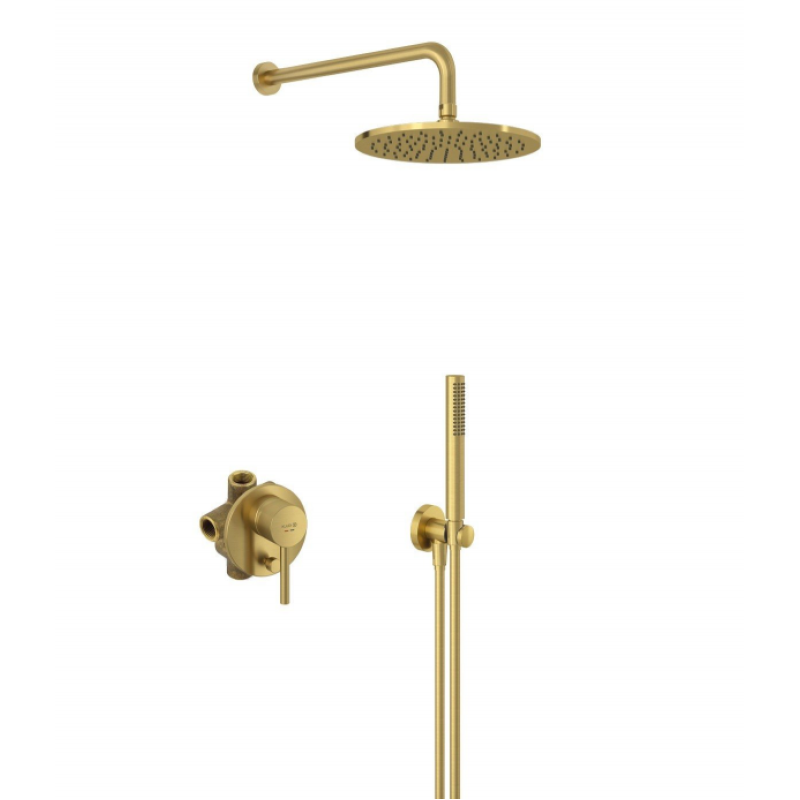 Тип: душевая система (внешняя и скрытая часть)Назначение: для душаМонтаж: настенный (внутристенный)Количество монтажных отверстий: 3Управление: рычажноеТип подводки: жесткаяСтандарт подводки: 1/2"Диаметр верхнего душа: 250 ммМинимальное рабочее давление: 1 барМаксимальное рабочее давление: 10 барКоличество и тип струи ручной лейки: 1 - бодрящаяКоличество и тип струи верхнего душа: 1 - бодрящаяКерамический картридж с ограничителем горячей водыМеханизм регулировки держателя ручной лейки: нерегулируемыйМатериал: латуньЦвет: брашированное золото