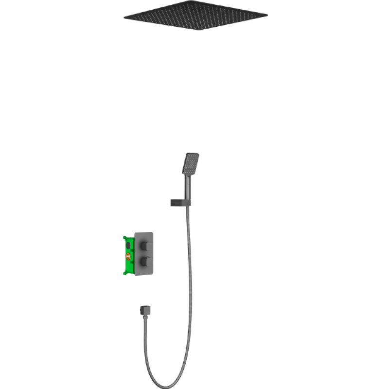Тип душевая система скрытого монтажа, с термостатом с квадратной лейкойУправление двухвентильноеДушевая система сделана из латуни класса АМатериал лейки тропического душа: латуньМатериал ручной лейки: пластикУгол наклона верхней лейки не регулируетсяШтанга душевой системы не регулируется по высотеРазмер верхнего душа: 500 x 500 ммДиаметр керамического картриджа: 35 мм,с термостатомКомплектация:Ручка дивертора 1 штРучка управления термостатом 1 штШланг душа 1,5 м 1 штОтвод из стены 1 штРучная лейка (пластик) 1 штДержатель ручной лейки (пластик) 1 штДекоративная накладка смесителя (латунная) 1 шт