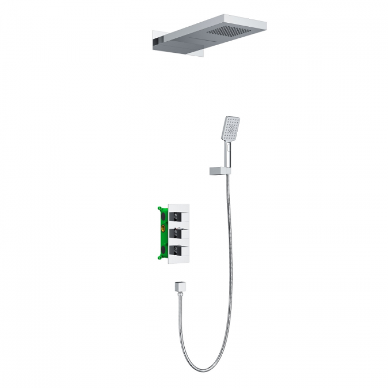 Тип душевая система скрытого монтажа, с термостатом с прямоугольной лейкойУправление трехрычажноеДушевая система сделана из латуни класса АМатериал лейки тропического душа: латуньМатериал ручной лейки: пластикУгол наклона верхней лейки не регулируетсяШтанга душевой системы не регулируется по высотеРазмер верхнего душа: 502 x 230 ммДиаметр керамического картриджа: 35 мм,с термостатомКомплектация:Смеситель с монтажной коробкой, скрытого монтажа, с термостатом 1 штТропический душ, настенный, скрытого монтажа, (латунный) 1 штКрепежные углы для тропического душа 1 штПодводка к тропической лейке 1 м 1 штРучная лейка 2-х режимная (пластик) 1 штДержатель ручной лейки (пластик) 1 штДекоративная накладка смесителя (латунная) 1 штРучка управления термостатом 1 штШланг душа 1,5 м 1 штОтвод из стены 1 штРучка дивертора 1 шт