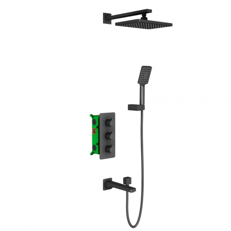 Тип душевая система скрытого монтажа, с термостатом с квадратной лейкойУправление трехрычажноеДушевая система сделана из латуни класса АМатериал лейки тропического душа: латуньМатериал ручной лейки: пластикУгол наклона верхней лейки регулируетсяРазмер верхнего душа: 250 x 250 ммУгол поворота керамической кран-буксы: 90°Комплектация:Смеситель с монтажной коробкой, скрытого монтажа, с термостатом 1 штШтанга тропического душа с декоративным отражателем 1 штТропический душ (латунный) 1 штРучная лейка (пластик) 1 штДержатель ручной лейки (пластик) 1 штДекоративная накладка смесителя (латунная) 1 штРучка дивертора 1 штРучка управления термостатом 1 штРучка переключения в режим "излив" 1 штШланг душа 1,5 м 1 штИзлив (латунный) 1 штОтвод из стены 1 шт
