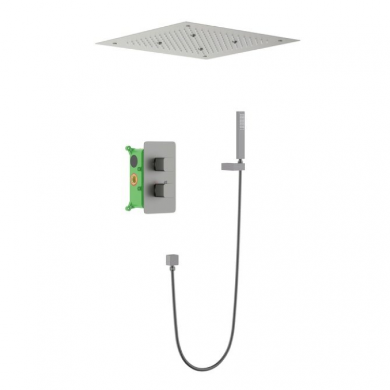 Основные преимущества встроенной системы: элегантный внешний вид, все коммуникации и крепления спрятаны в стену и потолок, снаружи видны только декоративные элементы. Установить встроенную систему можно в любом месте. Использовать такой смеситель очень удобно, регулировка температуры воды осуществляется ручкой термостата (расположена снизу). Режим "тропический душ" и увеличение напора осуществляется поворотом ручки дивертора (расположена сверху) влево.