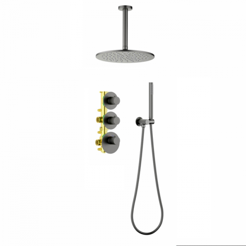 Душевая система с термостатом Saona 2399 относится к премиальному сегменту, предназначена для монтажа в полой или твердой стене. Верхний душ с вертикальным потолочным креплением выполнен из латуни. Термостатический картридж поддерживает стабильную температуру воды, обеспечивая максимально комфортные условия для принятия водных процедур. Регулируя напор воды в режиме "тропический душ" можно получить массажное воздействие различной интенсивности. Основные преимущества встроенной системы: элегантный внешний вид, все коммуникации и крепления спрятаны в стену, снаружи видны только декоративные элементы. Установить встроенную систему можно в любом месте. Регулировка температуры воды осуществляется ручкой термостата (расположена снизу). Включение режима "тропический душ" и регулировка напора осуществляется поворотом ручки дивертора (расположена сверху) влево.Тип: душевая система с термостатом Назначение: для ванны и душаМонтаж: встраиваемыйКоличество монтажных отверстий: 3Тип дивертора: дивертор с керамическими пластинамиВстраиваемая часть: в комплектеМеханизм: термостатический картриджСтандарт подводки: 1/2"Управление: вентильноеМатериал: латунь класса АЦвет: черное золото