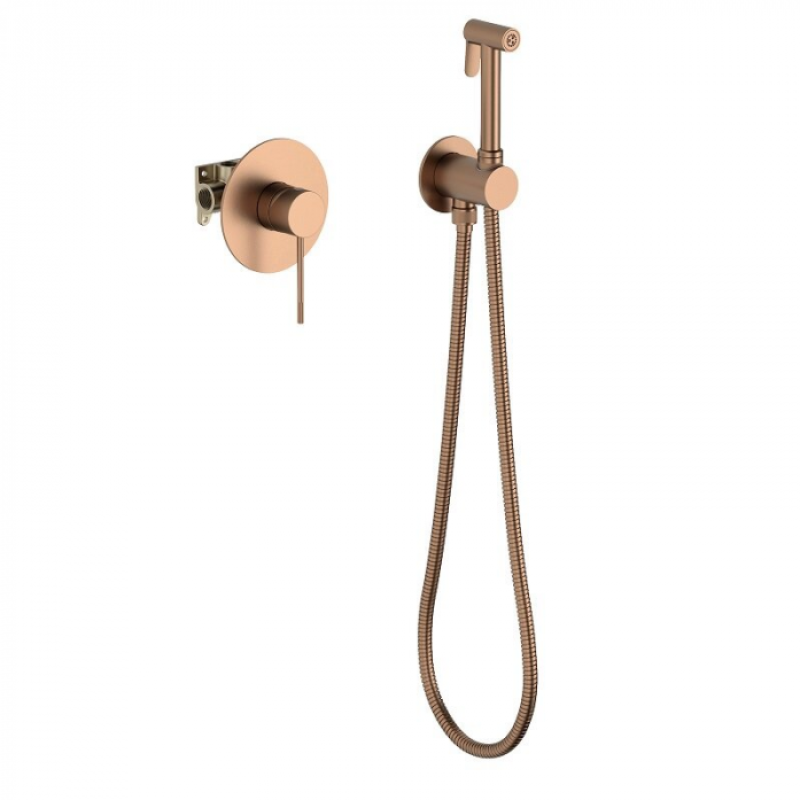 Встраиваемый смеситель с гигиеническим душем Timo Saona 2389 предназначен для монтажа в твердой или полой стене. Основной задачей данной модели является: экономия места (установка чаши для биде занимает достаточно много места и к тому же затратнее). Все коммуникации, крепления и механизмы спрятаны в стену и закрыты декоративной накладкой, снаружи находится только рычаг управления смесителем и держатель гигиенической лейки с подключением шланга, такая модель отлично сочетается с инсталляцией для унитаза. Длины шланга 1,2 метра хватает для решения гигиенических задач. Можно также использовать например, для мытья собаки после прогулки или наполнения ведра воды и т.д.Тип: смеситель Назначение: для гигиенического душаМонтаж: встроенныйКоличество монтажных отверстий: 2Управление: рычажноеТип подводки: гибкаяСтандарт подводки: 1/2"Тип излива: фиксированный Материал: латунь класса А Цвет: розовое золото