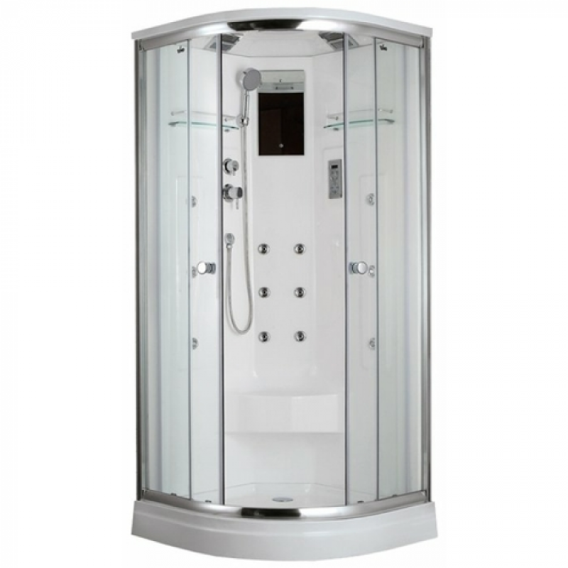Душевая кабина Timo Lux T-7709 выделяется достаточно широким проемом входа, стильным дизайном и интересным стилем. Устойчивый невысокий поддон в форме четверти круга выполнен из высококачественного акрила с антибактериальными свойствами поверхности. Основа кабины изготовлена с применением технологии t-жесткости, которая делает конструкцию устойчивой к деформации. Преимущества данной душевой кабины заключаются в следующем: антискользящее покрытие поддона, ударопрочное прозрачное закаленное стекло толщиной 6 мм, покрытие стекла водоотталкивающее, усиленный каркас поддона.  Характеризуется данная модель еще и обширным функционалом: тропический ливень, раздельный гидромассаж (вертикальный и спинной), радио, сенсорный пульт последнего поколения, мощный вентилятор, 4-режимный смеситель. Тихую  работу раздвижных дверей обеспечивают металлические ролики с полимерным покрытием и магнитные уплотнители. В комплект входят зеркало, полочки, душевая лейка и др.  Тип: закрытая кабинаФорма: четверть кругаПоддон: низкийМатериал поддона: акрилЦвет акрила: белыйКонструкция дверей: раздвижныеКоличество створок двери: 2Толщина стекла: 6 ммМатериал задних стенок: стеклоИсполнение стенок: прозрачноеМатериал профиля: алюминиевыйЦвет профиля: глянцевый хромОсвещение: верхнееРучной душ: многофункциональныйВерхний душ: тропический ливеньУправление: сенсорноеВес: 110 кг