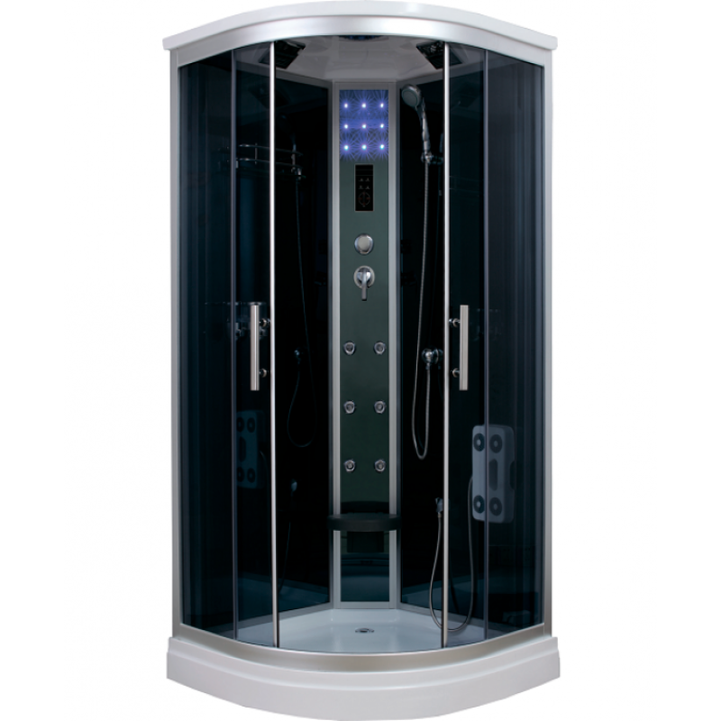 Базовая комплектация:Акриловый поддон h - 15 см. с сифоном и усиленным каркасом.Анодированный алюминиевый профиль (матовый хром).Закаленное ударопрочное безопасное стекло толщиной 5 мм.Сенсорный пульт управления.Подсветка верхняя и боковая.FM-радио. Смеситель однорычажный - четыре режима.Тропический душ.Лейка.Массажер ступней.Гидромассаж спины 6 джет.Двойные ролики.Стеклянная полочка.Откидное сиденье с допустимой нагрузкой не более 50 кг.Диспенсер.Ручки.Вентиляция.