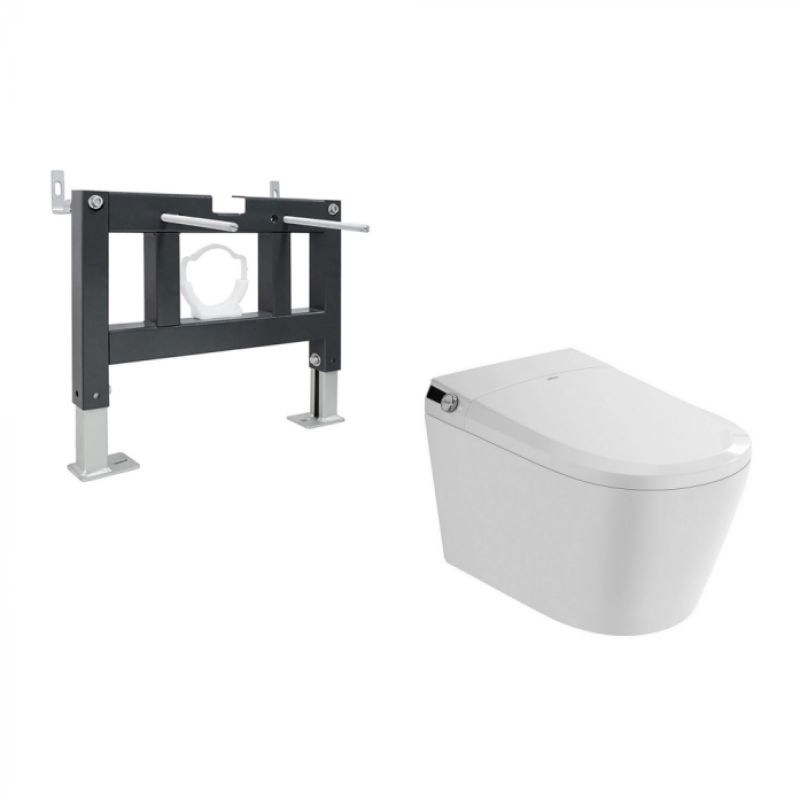 Функции электронного унитаза:LED дисплейночная подсветкапульт дистанционного управленияуправление одной кнопкойрежимы обмыва: общий, женский, детскийсушка теплым воздухомкрышка-сиденье с подогревомрегулировка давления и температуры водырегулировка температуры воздухасамоочищающаяся форсункаУФ стерилизацияавтоматический смывдатчик сиденьядатчик приближения и датчик ногикрышка и сиденье открываются автоматическиимпульсный смыв без бачкапрямое подключение к водопроводуТип: подвесной унитаз + инсталляцияДлина: 59 смШирина: 37 смВысота: 39 смОбъем смыва: 2/4,2 лАнтивсплеск: естьРежим смыва: импульсныйВыпуск: горизонтальныйФорма: прямоугольнаяУстановка бачка: не требуетсяЭлектронный унитаз: даФункция биде: естьСиденье в комплекте: естьМикролифт: естьАнтигрязевое покрытие: естьМатериал сиденья: дюропластМатериал унитаза: керамикаЦвет: белый