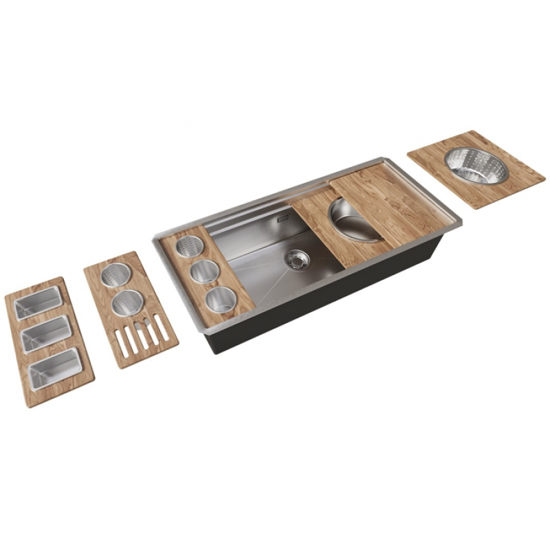 Кухонная мойка из нержавеющей стали с PVD покрытием EMAR EMB-111 Данная модель укомплектована множеством аксессуаров и представляет собой многофункциональное рабочее пространство. Аксессуары выполнены из влагостойкого и прочного материала – Сапеле и нержавеющей стали.    Мойка из нержавеющей стали AISI. AISI 304 содержит 18% хрома и 9% никеля, что обеспечивает максимальную устойчивость к коррозии. PVD покрытие (метод покраски путем напыления в вакууме) встраивается в кристаллическую решетку металла, образуя прочный защитный слой. Легко удаляется жир, налет и разводы от воды. Установленные, на дне и по бокам чаши, резиновые шумопоглощающие накладки и нанесенное антиконденсатное покрытие, делают мойку бесшумной.Основные характеристики мойки:Размеры мойки 1143 x 476 ммРазмеры чаши: 1093 x 426 х 254 ммМонтажная тумба от 1200 ммТолщина стали: 1.2 ммСпособ монтажа: под столешницу / в уровень со столешницей / врезнойРазмер сливного отверстия: 90 ммРазмер упаковки: 1260 x 600 x 380 ммВес брутто: 30 кгВес нетто: 12 кгГарантия на мойку (сталь) — 5 лет.