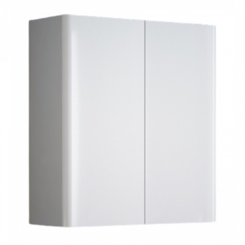 Подвесной шкаф имеет интересный эргономичный дизайн - скругление боковин плавно переходит в скругления на фасадах. У шкафа 2 распашные двери, позади - 2 вкладные полки, которые можно регулировать по высоте (есть дополнительные отверстия для полкодержателей). Высота между полками по 23 см. Все двери имеют вкладные петли с доводчиками Firmax. Ручек нет, конструктив шкафа позволяет открывать двери без использования ручек. Присутствуют подвесы для крепления на стене.