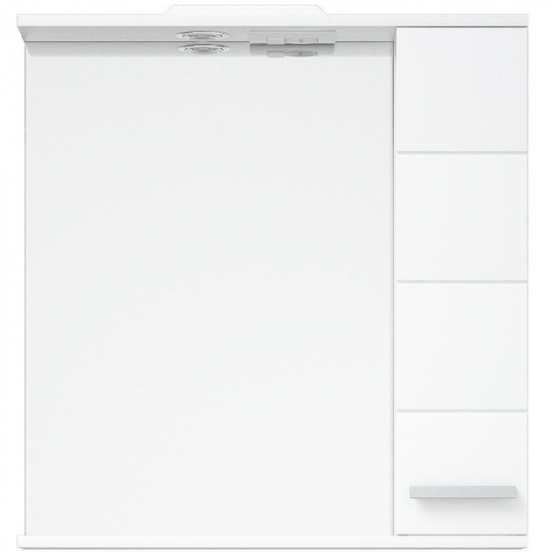 Зеркальный шкаф выполнен из влагостойкого МДФ, покрытого белой глянцевой пленкой. Мебель комплектуется фурнитурой высокого качества, дверными петлями со встроенными доводчиками и удобными наклонными ручками. Линейная фрезеровка на фасадах придаст индивидуальность и задаст особый ритм Вашей ванной комнате. Зеркало-шкаф оснащён распашной дверью справа, слева находится зеркало. За дверью расположены полочки. Петли с доводчиками. Зеркало-шкаф - с подсветкой, 1 светильник. Фасад, верхняя и нижние крышки - МДФ в плёнке.
