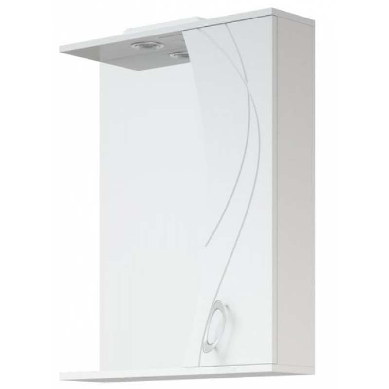 Зеркало-шкаф оснащено распашной дверью справа, слева - зеркало. За дверью 2 вкладные полочки. Петли с доводчиками. Зеркало-шкаф с подсветкой. Верхняя, нижняя крышки, дверь - МДФ в плёнке ПВХ.