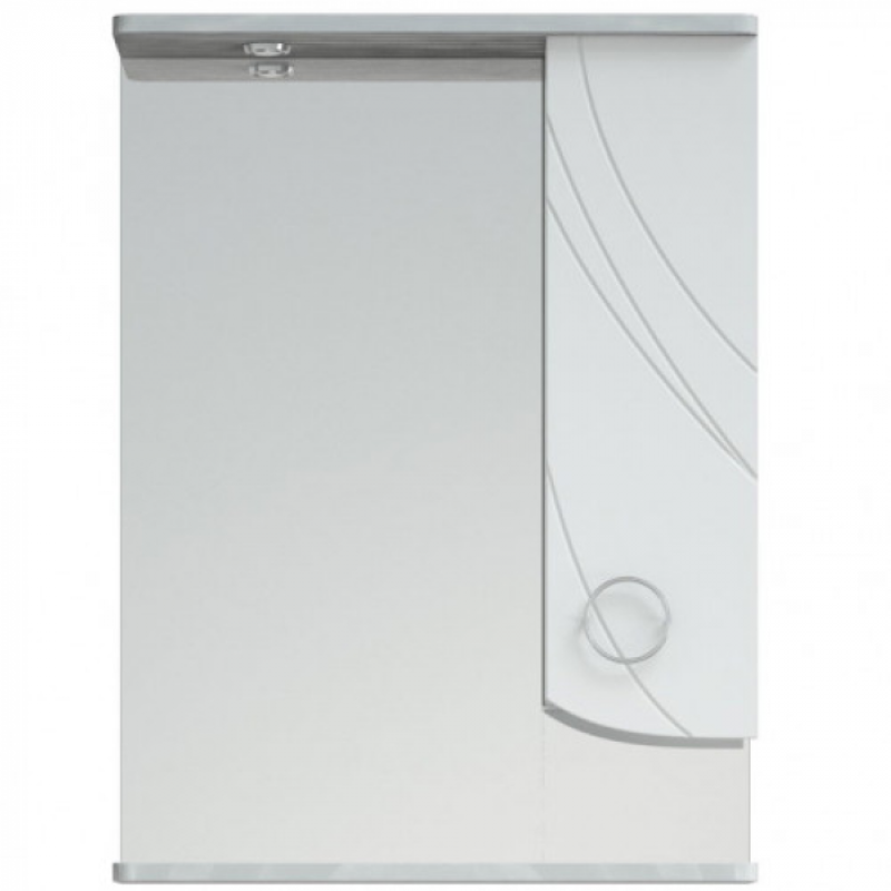 Зеркало-шкаф оснащёно распашной дверью справа, слева зеркало. За дверью 2 вкладные полочки. Петли с доводчиками. Зеркало-шкаф с подсветкой, 1 светильник. Верхняя, нижняя крышки, дверь - МДФ в плёнке ПВХ.