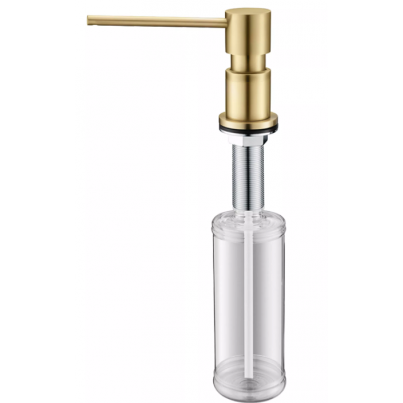 Тип: дозатор для жидкого мылаНазначение: для кухонной мойкиМонтаж: на мойку, на столешницуУстановка в столешницы толщиной: до 47 ммДиаметр монтажного отверстия для установки: 35 ммНосик дозатора поворачивается на: 360°Тип управления: механическийПенообразователь: нетОбъем: 0,35 лМатериал: латунь, пластикЦвет: светлое золото