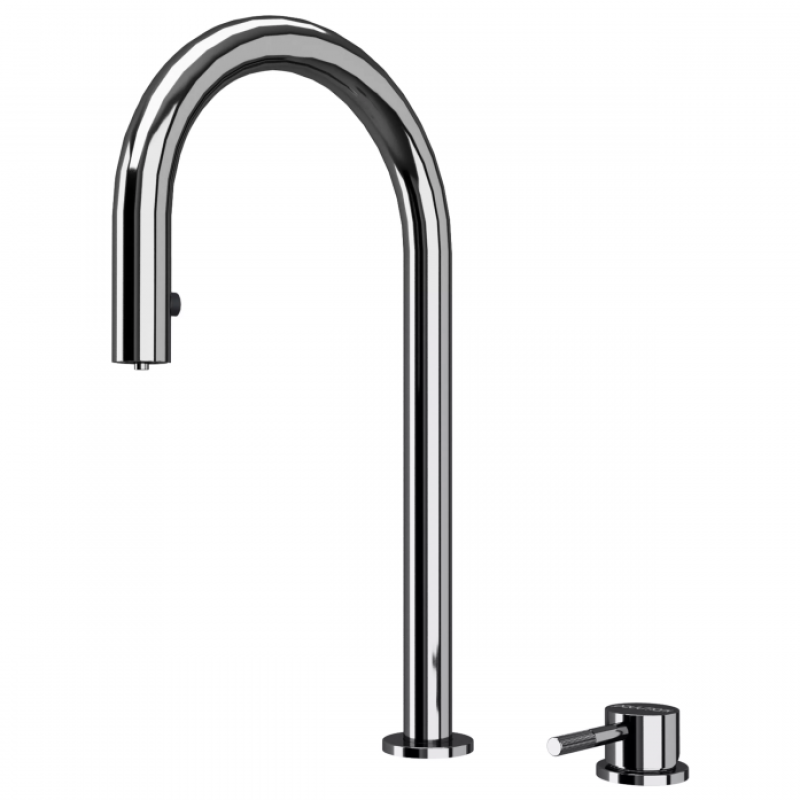 Смеситель в современном стиле ESTETICA оснащен функциями подключения фильтра питьевой воды и выдвижения излива. Выдвижной излив дает удобство в уходе за мойкой и свободу в наполнении емкостей не только в мойке, но и рядом с мойкой на столешнице. Вынесенный отдельно рычаг управления подчеркивает лаконичный дизайн корпуса смесителя. Рычаг управления 2в1 позволяет переключать подачу холодной, горячей и питьевой воды одним движением.Тип: смеситель с выдвижным изливомНазначение: для кухниТип установки: на мойку/столешницуКоличество отверстий для монтажа: 2Управление: рычажноеВозможность подключения системы фильтрации питьевой воды: даОтдельный выпуск для фильтрованной воды: даФункции струя и душ: даТип подводки: гибкаяСтандарт подводки: 1/2"Излив: выдвижнойМатериал: латунь  Цвет: хром
