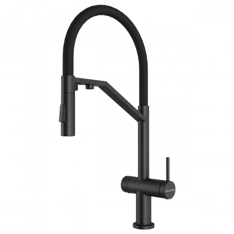 Многофункциональный смеситель для кухни ZENDER оснащен функциями подключения фильтра питьевой воды и гибким силиконовым изливом с двумя режимами подачи водопроводной воды: струя и душ. Для переключения режимов струя / душ служит кнопка на конце излива. Управление питьевой водой производится поворотом ручки, расположенной слева. Питьевая вода подается из отдельного аэратора. Для удобства использования ручка управления питьевой водой имеет декоративные лазерные насечки.Тип: смеситель с подключением к фильтру для водыНазначение: для кухниУстановка: на мойку / на столешницуКоличество отверстий для монтажа: 1Диаметр монтажного отверстия: 35 ммВозможность подключения системы фильтрации питьевой воды: даОтдельный выпуск для фильтрованной воды: даФункции струя / душ: даУправление: рычажноеТип подводки: гибкаяСтандарт подводки: 1/2"Излив: гибкийАэратор: даМатериал: латунь / силиконЦвет: черный