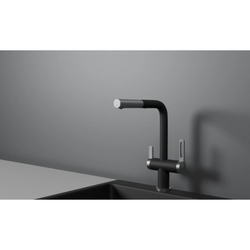 Тип: смеситель с выдвижным изливом и подключением к фильтруНазначение: для кухонной мойкиМонтаж: на мойку, на столешницуКоличество монтажных отверстий: 1Управление: рычажноеМеханизм: керамический картриджДиаметр керамического картриджа: 35 ммТип подводки: гибкая  Стандарт подводки: 1/2"Вращение излива: поворотныйВыдвижной излив: даПодключение к фильтру с питьевой водой: даКомплектация: гибкая подводка, комплект креплений, переходник для подключения фильтра с питьевой водойМатериал корпуса: нержавеющая стальЦвет: шварц