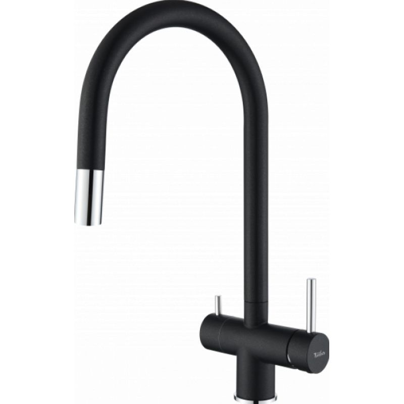 Тип: смеситель с краном питьевой воды и выдвижной лейкойНазначение: для кухонной мойкиМонтаж: горизонтальный (стандартный)Установка: на мойку, на столешницуКоличество монтажных отверстий: 1Тип управления: рычажныйВращение излива: поворотныйЗапорный клапан: керамический картриджДиаметр картриджа: 35 ммТип подводки: гибкая  Стандарт подводки: 1/2"Выдвижной излив: даПодключение питьевого фильтра: даМатериал: нержавеющая стальЦвет:  nero  cromo