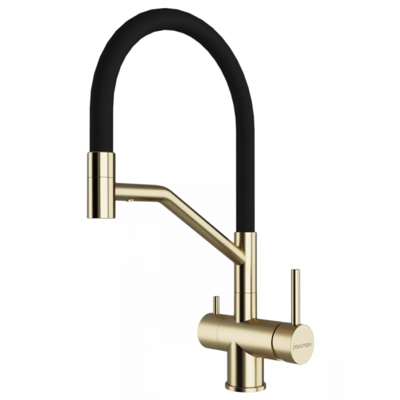 Смеситель RUBERT оснащен функциями подключения фильтра питьевой воды и гибким силиконовым изливом, который фиксируется элементом корпуса в форме кольца. Питьевая вода подается из отдельного аэратора.Тип: смеситель с подключением к фильтру для водыНазначение: для кухниУстановка: на мойку / на столешницуКоличество отверстий для монтажа: 1Диаметр монтажного отверстия: 35 ммВозможность подключения системы фильтрации питьевой воды: даУправление: рычажноеТип подводки: гибкаяСтандарт подводки: 1/2"Излив: гибкийАэратор: даМатериал: латунь / силиконЦвет: светлое золото