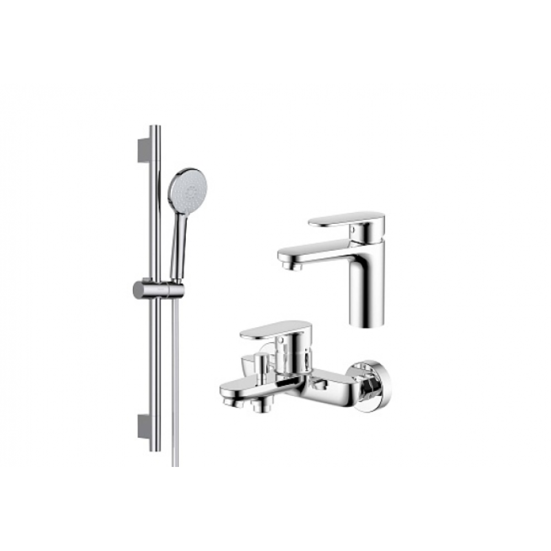 Смеситель для раковиныВ комплекте: смеситель, гибкая подводка 60 см, монтажный комплектВысота излива (см): 8,7Длина излива (см): 10,9Аэратор: Neoperl, ШвейцарияГибкая подводка в комплектеДлина гибкой подводки (см): 60Тип резьбового соединения: M10Стандарт подводки: 1/2"Вращение излива: фиксированныйТип управления: рычажныйНазначение: для умывальникаКоличество монтажных отверстий: 1 отверстиеПодключение к системе водоснабжения: гибкая подводкаМеханизм: керамический картридж Sedal, ИспанияДиаметр картриджа (мм): 35Максимальный объем расхода воды для смесителя на раковину при 3 барах: 16,4 л/минОсобенности: однорычажная система регулировки силы струи и температуры воды цельный корпус смесителя снижает вероятность протечек легкая очистка аэратора оптимальная длина подводкиСмеситель для ванныВ комплекте: смеситель S-образные эксцентрики декоративные отражателиДлина излива (см): 16,4Аэратор: Neoperl, ШвейцарияДивертор: вытяжнойМежцентровое расстояние (мм): 150Стандарт подводки: 1/2"Вращение излива: фиксированныйТип управления: рычажныйНазначение: для ванныКоличество монтажных отверстий: 2 отверстияПодключение к системе водоснабжения: эксцентрикиМеханизм: керамический картридж Sedal, ИспанияДиаметр картриджа (мм): 35Максимальный объем расхода воды для излива при 3 барах: 18,3 л/минОсобенности: однорычажная система регулировки силы струи и температуры воды цельный корпус смесителя снижает вероятность протечек легкая очистка аэратора латунный вытяжной переключатель на душ Душевой гарнитурВ комплекте: душевая штанга держатель душевой лейки душевая лейка душевой шланг монтажный комплектОсновной материал: нержавеющая стальМатериал шланга: поливинилхлорид (ПВХ)Материал стойки: нержавеющая стальМатериал лейки: ABS-пластикВысота стойки (см): 70Переключение режимов лейки: кнопочноеКоличество режимов лейки: 3Наличие лейки и шланга: лейка и шланг в комплектеНазначение: для душаДлина шланга (см): 150Размер/диаметр ручной лейки (см): 24,3х5,4х 10,2Максимальный объем расхода воды для ручного душа при 3 барах: 21,4 л/минОсобенности: передвижной держатель лейки 3-х режимная душевая лейка увеличенный диаметр лейки оптимальная длина шланга высококачественные материалы