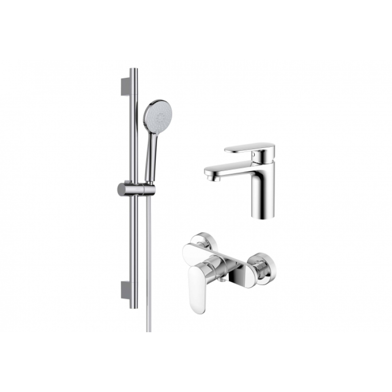 Смеситель для раковиныВ комплекте: смеситель, гибкая подводка 60см, монтажный комплектВысота излива (см): 8,7Длина излива (см): 10,9Аэратор: Neoperl, ШвейцарияГибкая подводка в комплектеДлина гибкой подводки (см): 60Тип резьбового соединения: M10Стандарт подводки: 1/2"Вращение излива: фиксированныйТип управления: рычажныйНазначение: для умывальникаКоличество монтажных отверстий: 1 отверстиеПодключение к системе водоснабжения: гибкая подводкаМеханизм: керамический картридж Sedal, ИспанияДиаметр картриджа (мм): 35Максимальный объем расхода воды для смесителя на раковину при 3 барах: 16,4 л/минОсобенности: однорычажная система регулировки силы струи и температуры воды цельный корпус смесителя снижает вероятность протечек легкая очистка аэратора оптимальная длина подводкиСмеситель для душаВ комплекте: смеситель S-образные эксцентрики декоративные отражателиМежцентровое расстояние (мм): 150Стандарт подводки: 1/2"Тип управления: рычажныйНазначение: для душаКоличество монтажных отверстий: 2 отверстияПодключение к системе водоснабжения: эксцентрикиДиаметр картриджа (мм): 35Механизм: керамический картридж Sedal, ИспанияМаксимальный объем расхода воды для ручного душа при 3 барах: 22,9 л/минОсобенности: однорычажная система регулировки силы струи и температуры воды цельный корпус смесителя снижает вероятность протечекДушевой гарнитурВ комплекте: душевая штанга держатель душевой лейки душевая лейка душевой шланг монтажный комплектОсновной материал: нержавеющая стальМатериал шланга: поливинилхлорид (ПВХ)Материал стойки: нержавеющая стальМатериал лейки: ABS-пластикВысота стойки (см): 70Переключение режимов лейки: кнопочноеКоличество режимов лейки: 3Наличие лейки и шланга: лейка и шланг в комплектеНазначение: для душаДлина шланга (см): 150Размер/диаметр ручной лейки (см): 24,3х5,4х 10,2Особенности: передвижной держатель лейки 3-х режимная душевая лейка увеличенный диаметр лейки оптимальная длина шланга высококачественные материалы