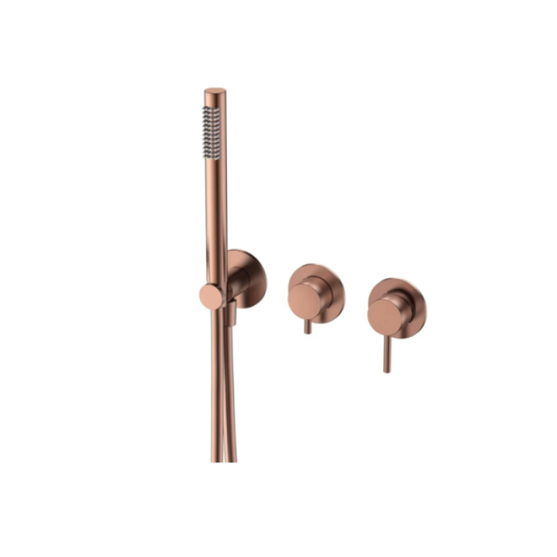 Тип: смеситель (внешняя и скрытая часть)Назначение: для душа, для ванныВстраиваемый смеситель: даМонтаж: на стенуУправление: рычажноеОтверстия для монтажа: на 3 отверстиеРассчитан на 3 потребителя: даВстраиваемая часть в комплекте: даДушевой шланг: в комплектеДлина шланга: 1500 ммДушевая лейка: в комплектеКоличество режимов ручного душа: 1Размер лейки: 225 х 24 ммМатериал: латунь, пластикЦвет: медь шлифованная