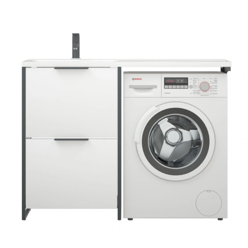 Металлический каркас стоит на двух опорах и одном кронштейне со стороны стиральной машины. Ящичная секция включает в себя 2 ящика, оснащенные системой мягкого закрывания с доводчиком. Внутреннее пространство ящиков имеет размер 374х518 мм, высота боковин 200 мм, высота от дна ящика до верхнего края фасада - 365 мм.